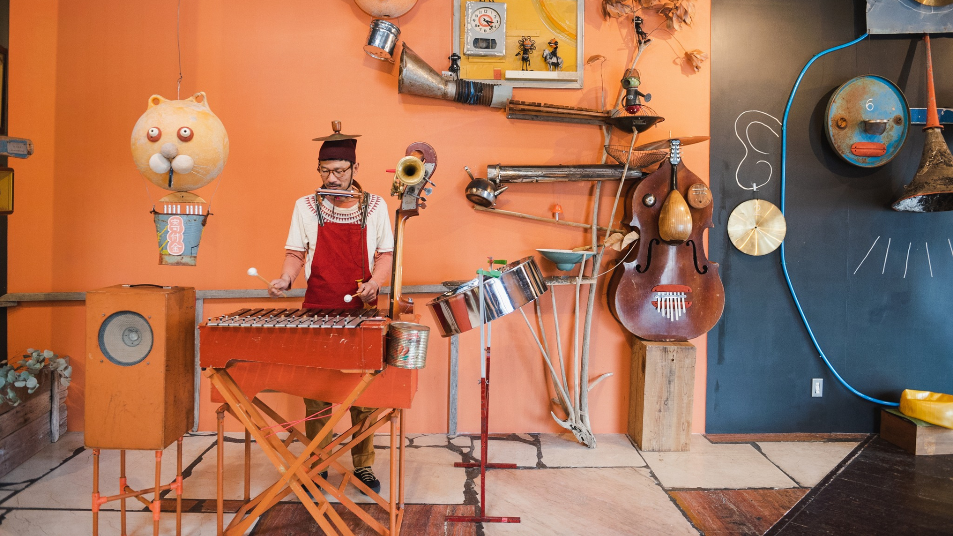 ICHI, from Nagoya in Japan, takes the notion of a one-man band to new limits, combining his quirky handmade instrument inventions (Stilt-bass, Kalilaphone, Balloon-pipes, Hatbox-pedal-drum, Tapumpet, Percussion-shoes & Hattrick-hat) with steel-drum, ping-pong balls, typewriter, toys & everyday objects all in the space of one short set. Somehow there’s an ancient, ritualistic feel to his performances – he’s like the misplaced leader of a tribe. To see ICHI live is to witness something so playful and unusual you know that you’re experiencing something entirely new. It`s fun, it`s danceable, it`s exciting.