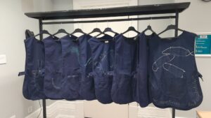 Installation You Never Asked My Name has been created by artist Jill Eastland with a group of migrant workers, refugees, asylum seekers and precarious workers. In the exhibition, the dark blue tabards worn by low paid and precarious workers are brought to life with embroidery and the stories of refugees and migrant workers.